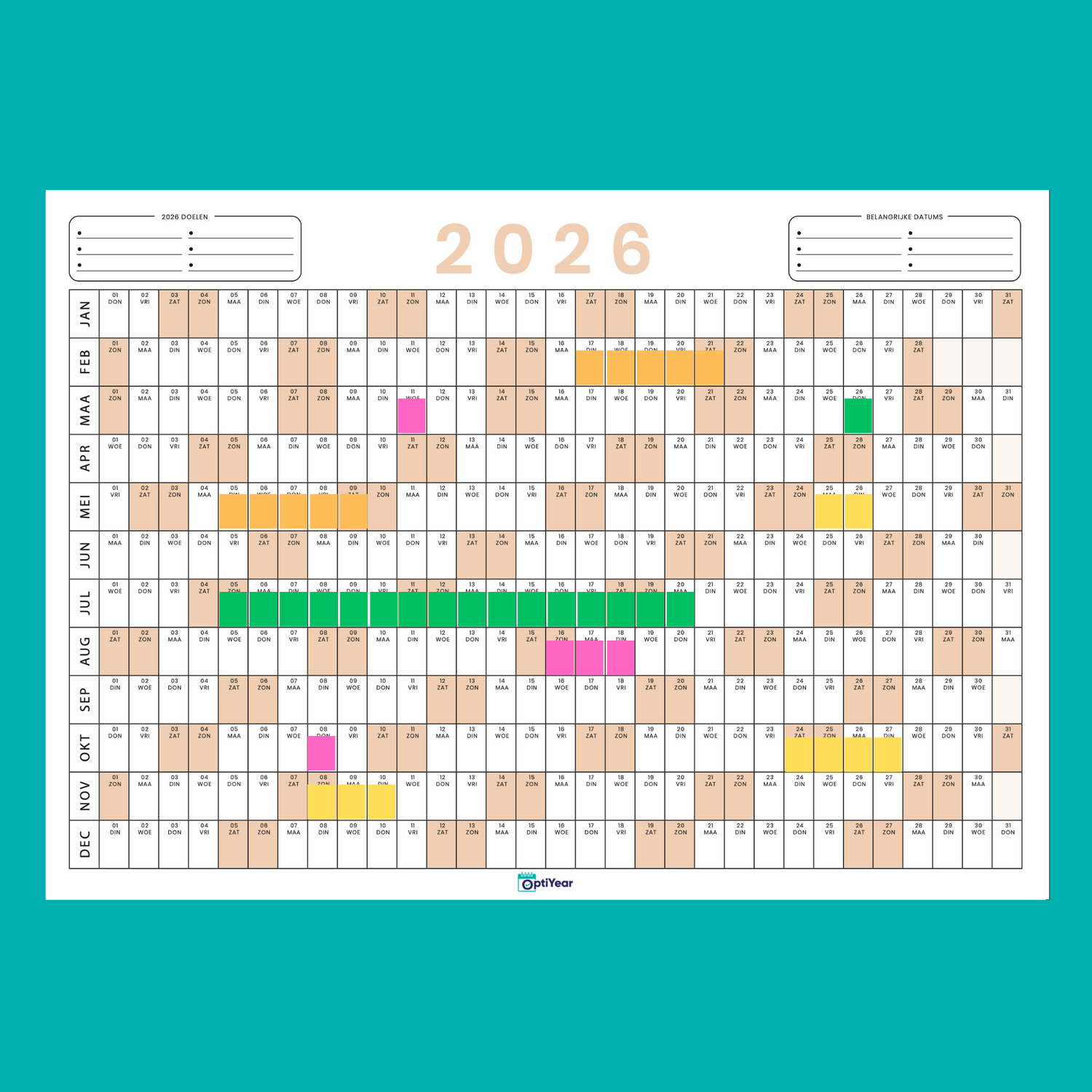Maak van 2026 jouw meest gestructureerde, overzichtelijke en productieve jaar ooit met de OptiYear jaarplanner 2026! Deze grote, duidelijke jaarplanner toont je in één oogopslag het volledige jaar — ideaal om doelen te stellen, projecten te plannen en rust in je hoofd te creëren.