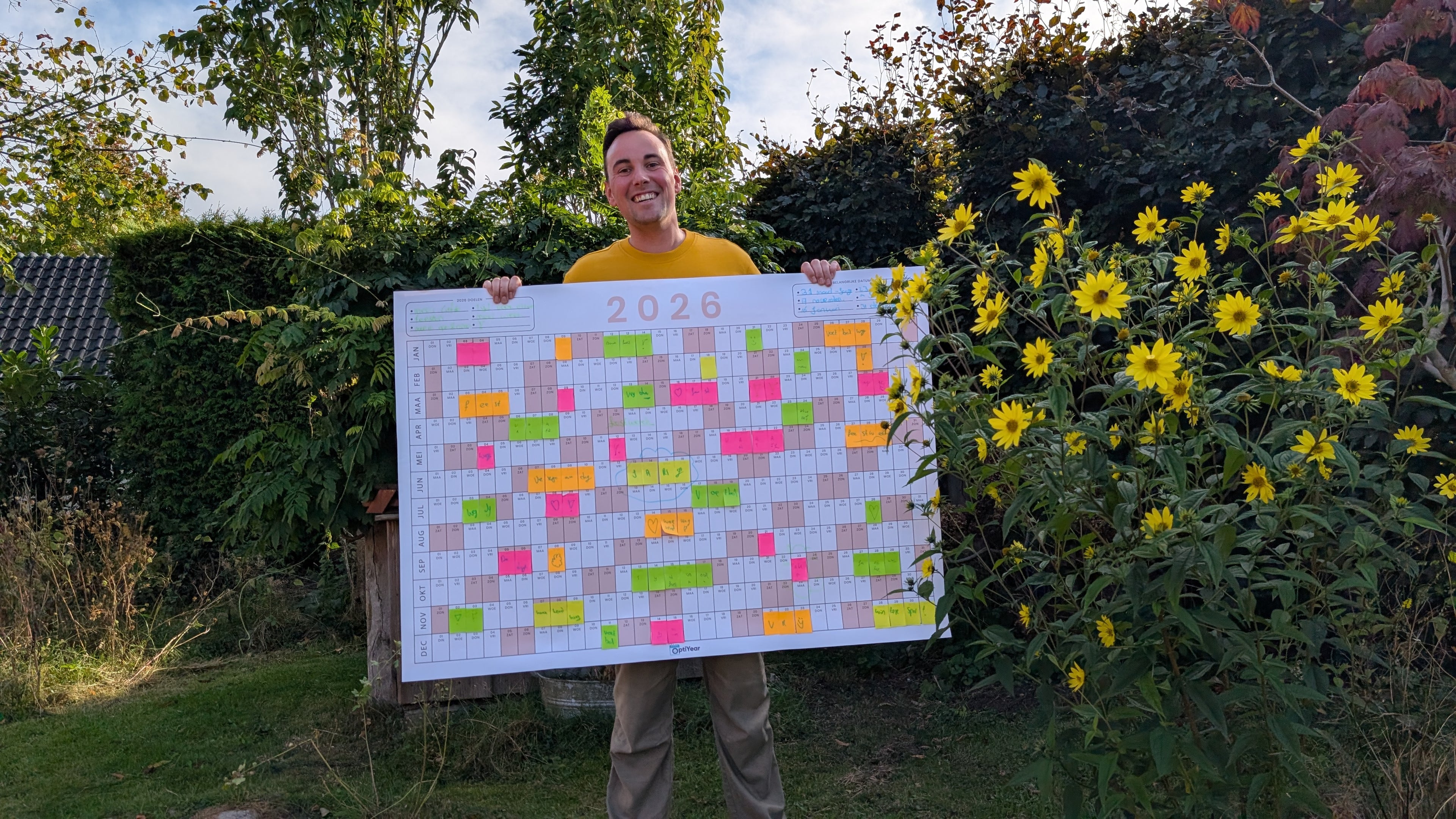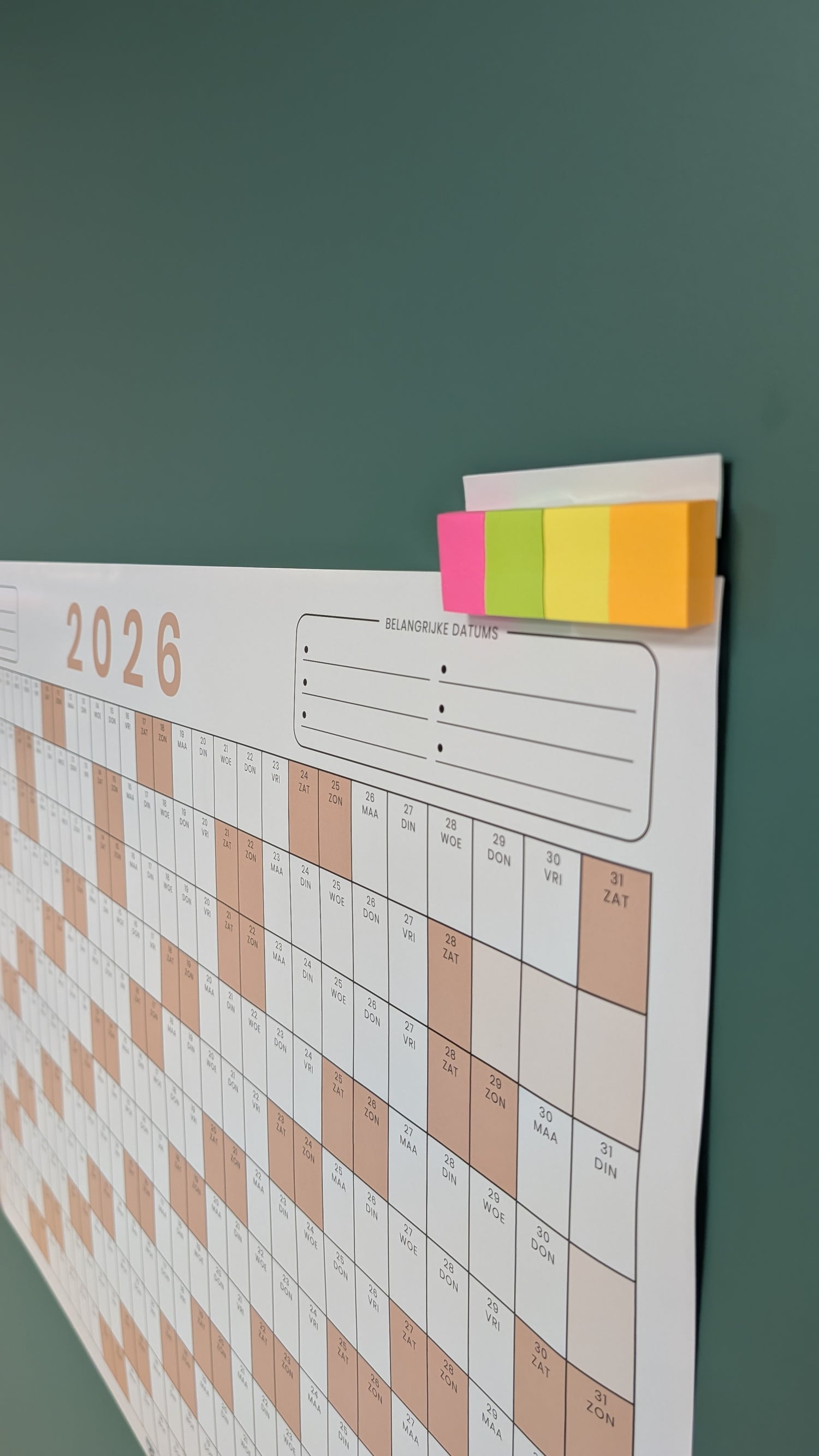 A1-formaat: 59,4 × 84,1 cm – groot genoeg voor een duidelijk jaaroverzicht, maar nog goed te plaatsen op een standaard muur.